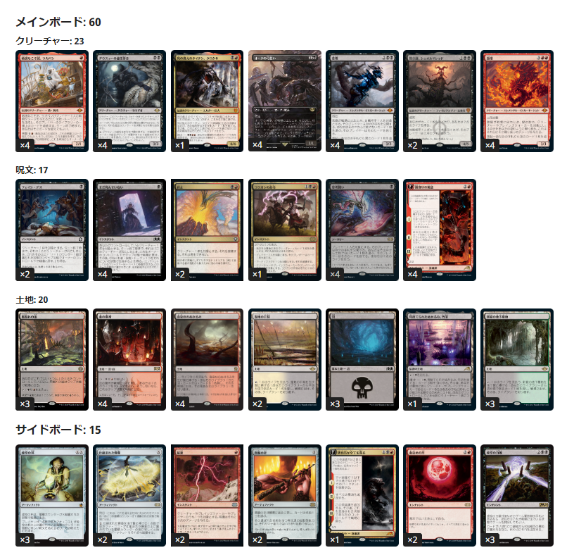 正直カジュアル寄りの初心者トーナメントに持ち込むのは憚られたが、1T悲嘆ブリンクはどうしても決めたかったし、激情二段攻撃もした過ぎたので、黒赤想起で挑むことにした。9月20日から紙を始めて、カードプールが広いモダンの環境で勝てるとはあんまり思ってなかったので、気持ちよく遊べるように頑張ろうという気持ちを込めた(黒赤想起を相手にした人は大変不快かもしれないが)